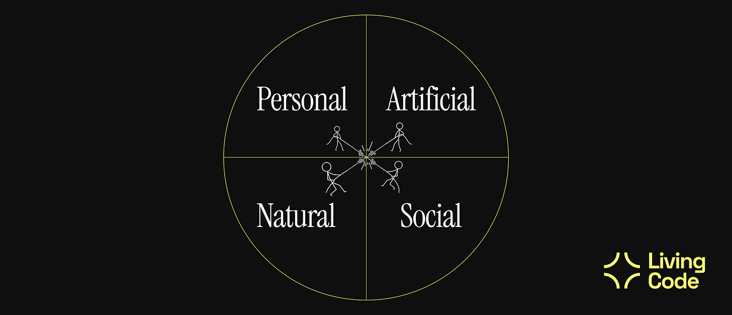 Four intelligences create tension in our world: Social, Personal, Artificial, and Natural. Those four intelligences operate inside of and through us. What we call “our” intelligence is a small and fragile biological incubator for a tiny subset of the world’s intelligence. Inside this bag of flesh, our nervous systems are growing an understanding of the four intelligences that surround us and make us up. Intelligence is coming to recognize itself.